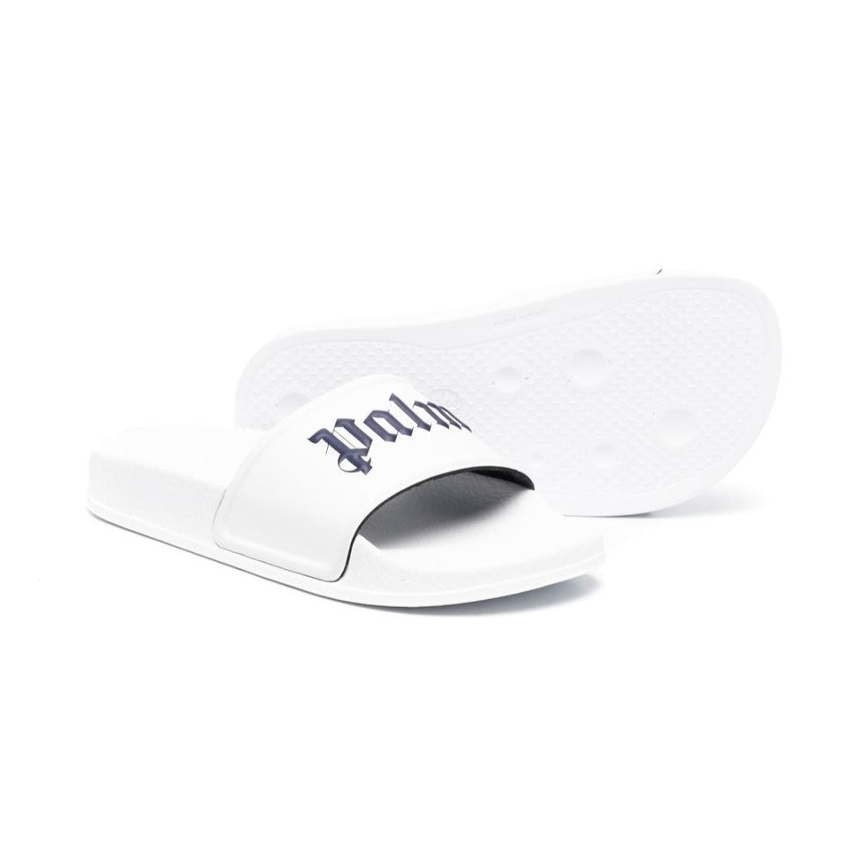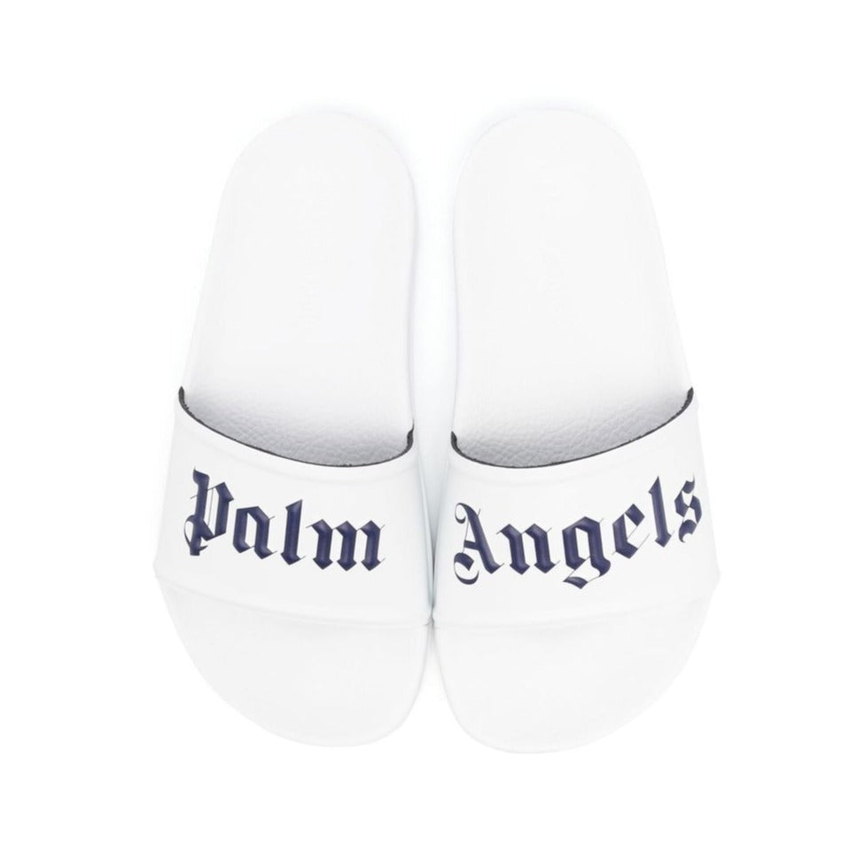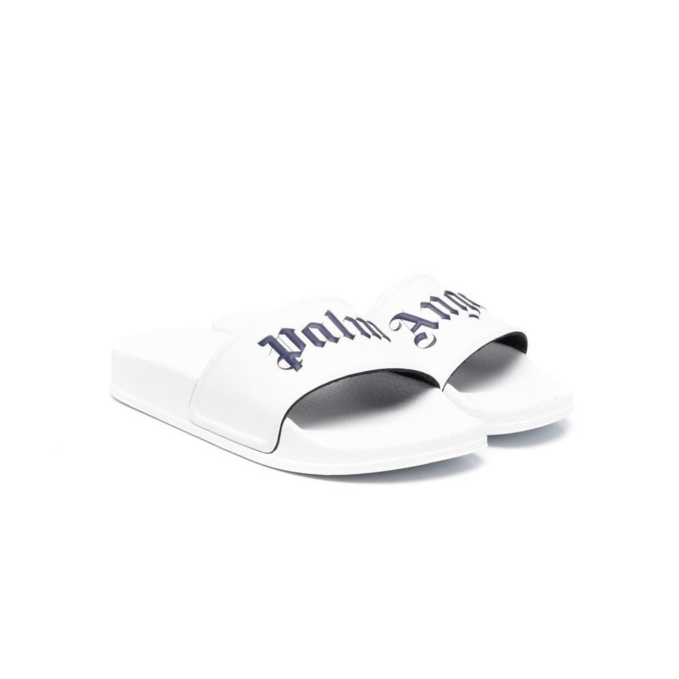 PALM ANGELS KIDS White Pool Slides With Navy Blue Logo. Mini-me style flip-flops from the urban brand Palm Angels.