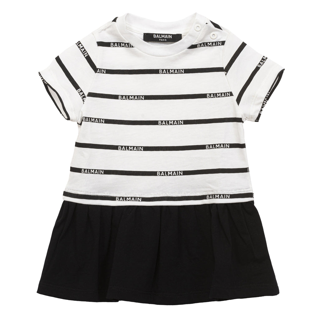 BALMAIN KIDS Black and White Summer Dress. Light and elegant dress, all over logo print with stripes, short sleeves, easy fastening on the shoulder.