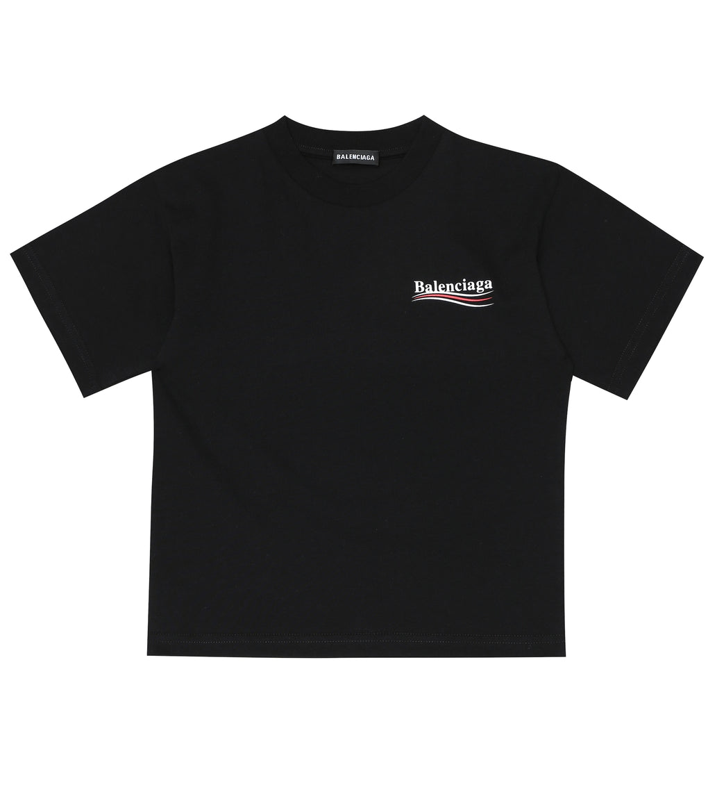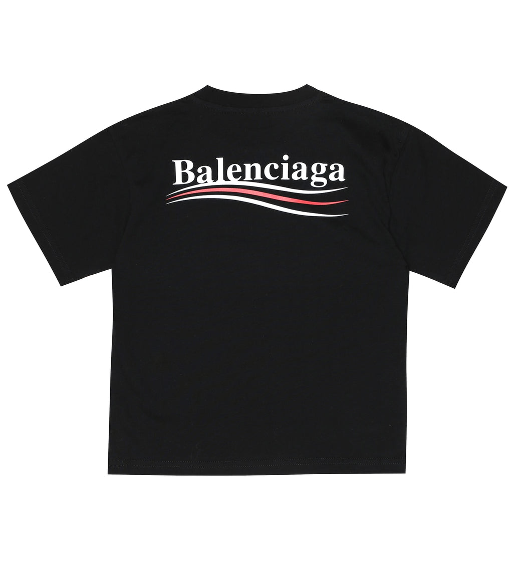 BALENCIAGA KIDS Black T-shirt With Logo. Mini-me style t-shirt from Balenciaga fashion maison. Crewneck t-shirt with short sleeves and Balenciaga Political Campaign logo. Limited collection with special sale price.