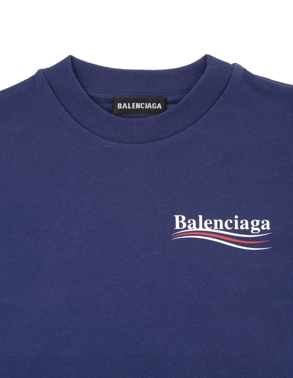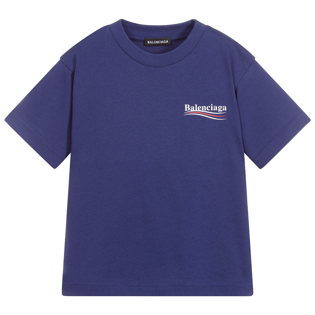 BALENCIAGA Navy T-shirt With Logo. A navy coloured cotton jersey T-shirt for boys and girls by luxury brand Balenciaga. Brand's white and red Political Campaign logo on the chest and back. Mini-me piece.