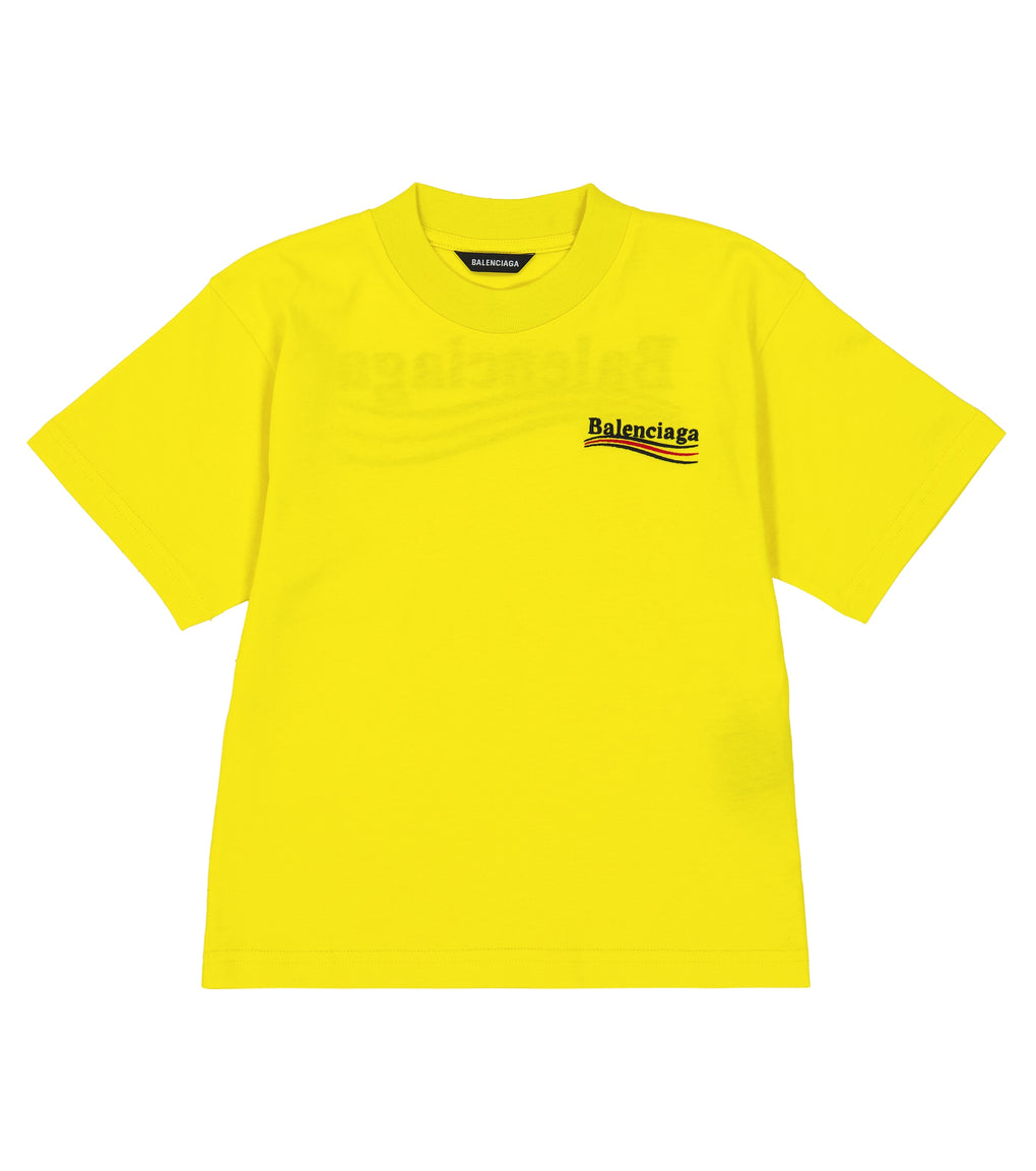 BALENCIAGA KIDS Yellow Logo T-shirt. Mini-me style short-sleeves t-shirt from Balenciaga fashion maison. Crewneck t-shirt with short sleeves and Balenciaga Political Campaign logo. Limited collection, last items available on sale.