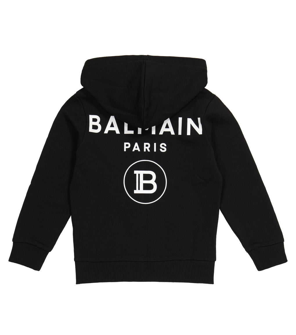 BALMAIN KIDS Black Hoodie Jacket. Black hoodie with stand-out logo print on the front, and an oversized logo on the back. Mini-me version from Balmain adult collection.