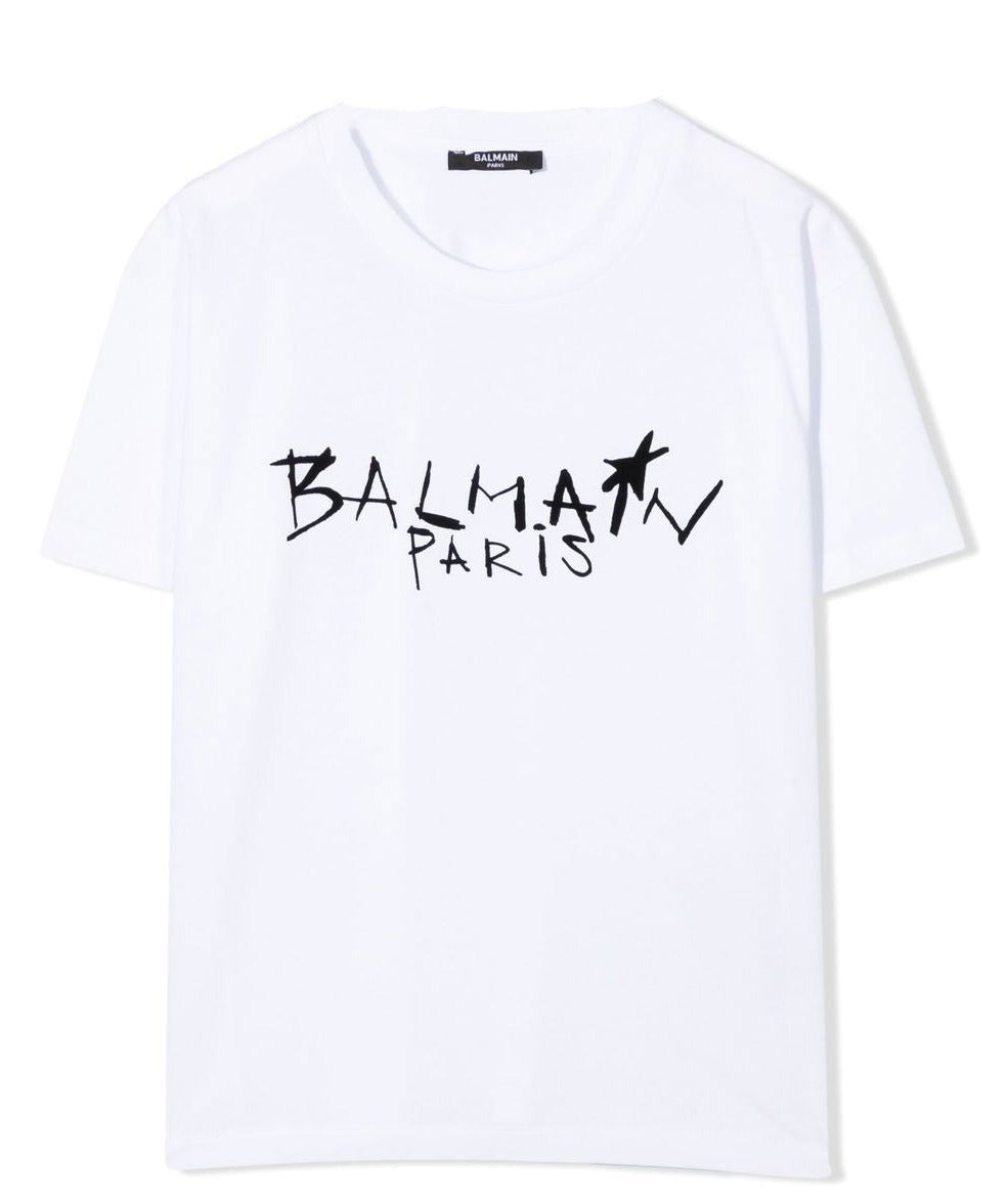 BALMAIN KIDS White T-shirt With Velvet Logo. Oversized fit t-shirt from the French fashion house, inspired by Balmain adult collection. Features unique velvet logo.