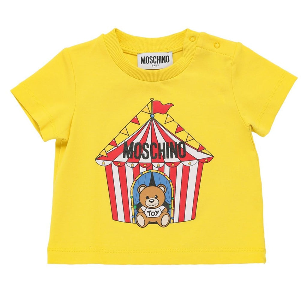 MOSCHINO BABY Yellow T-shirt with Circus Teddy Bear illustration. Classical short sleeves t-shirt for babies and toddlers.
