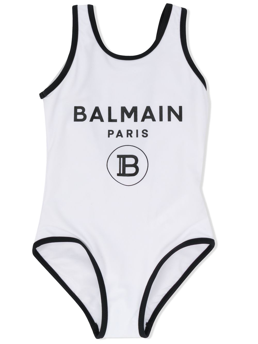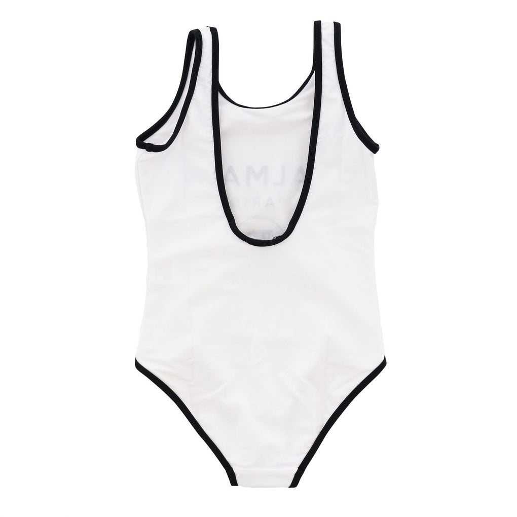 BALMAIN KIDS White Swimsuit with logo. Classical swimsuit with contrasting black trim and shoulder straps, lower back.