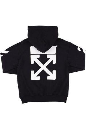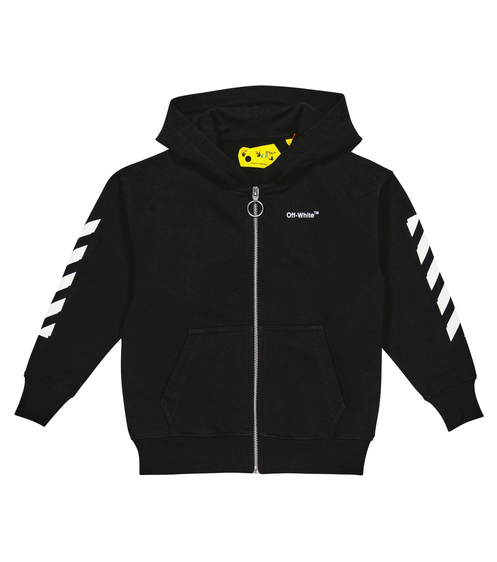 OFF-WHITE KIDS Black Zipped Hoodie with white logo and signature stripes, rubber arrows on the back. Cool urban piece from Off White Kids label.