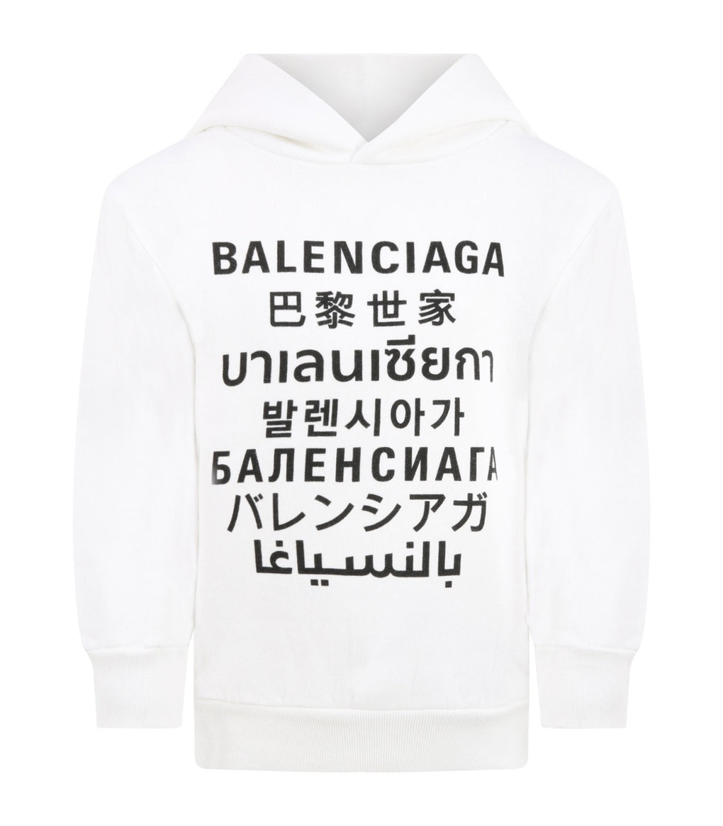 BALENCIAGA White Hoodie with Languages. Mini-me style fashion item, carries the spirit of Balenciaga adult collection. Regular fit.