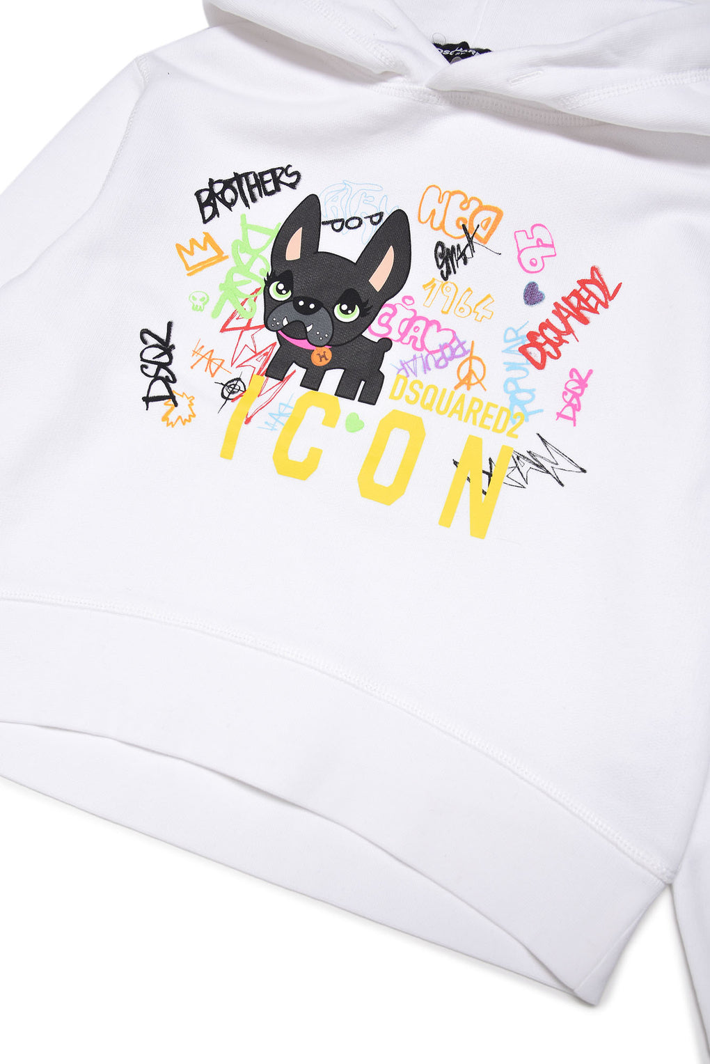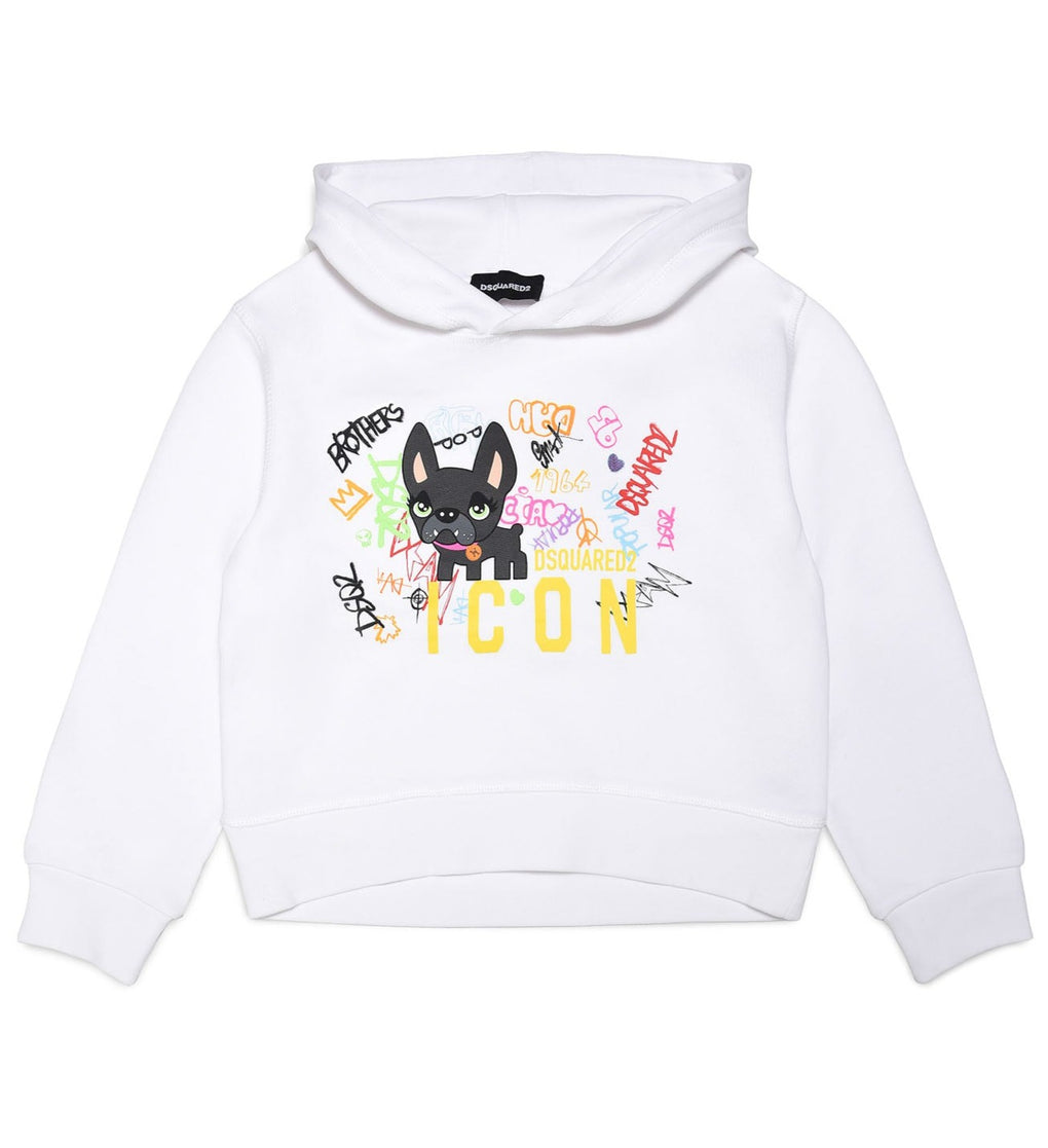 DSQUARED2 KIDS White ICON hoodie with iconic "Giro" dog illustration. Fun hoodie made of high quality cotton. Limited collection. Last items available at designer fashion sale price.