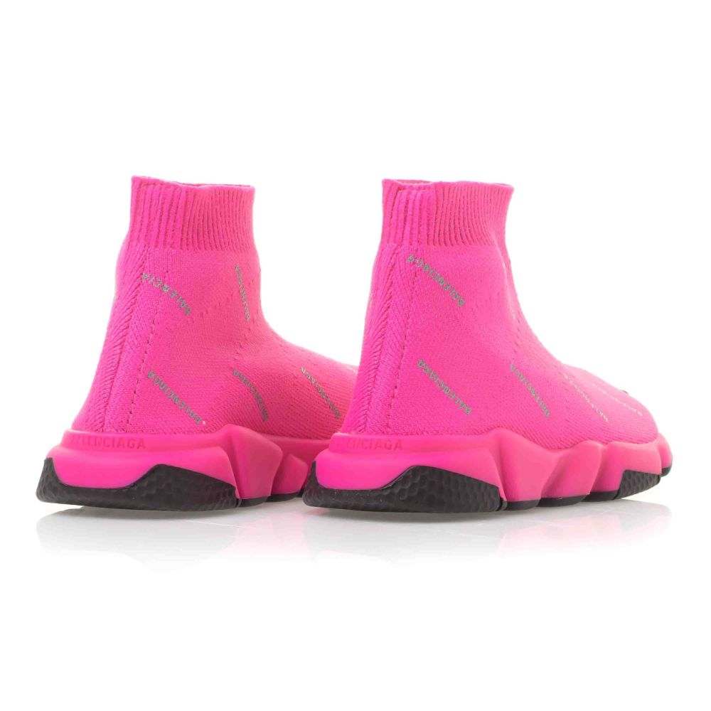 BALENCIAGA KIDS Fuchsia Pink Speed Trainers with all over logo print. Comfortable stretch-fabric sneakers. Mini-me style fashion item from Balenciaga. Limited collection, last sizes available!
