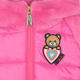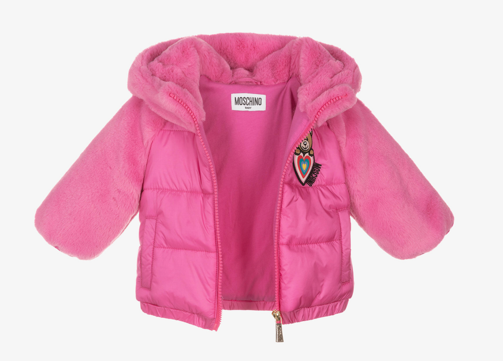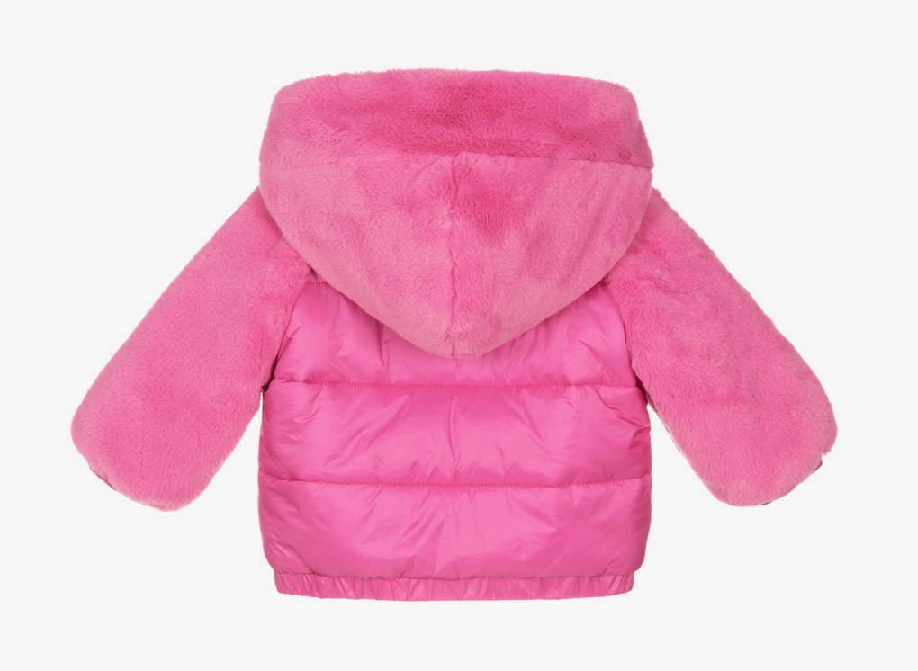 MOSCHINO BABY Fuchsia coloured faux-fur and nylon puffer jacket. This cute jacket has zip fastening and a hood. High quality jacket for little fashion lovers.