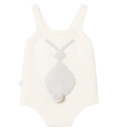 STELLA MCCARTNEY KIDS Knitted Bodysuit With Bunny on the back. Ivory white bodysuit, knitted from wool-fused cotton. Features a happy lion. 96% cotton, 4% wool.