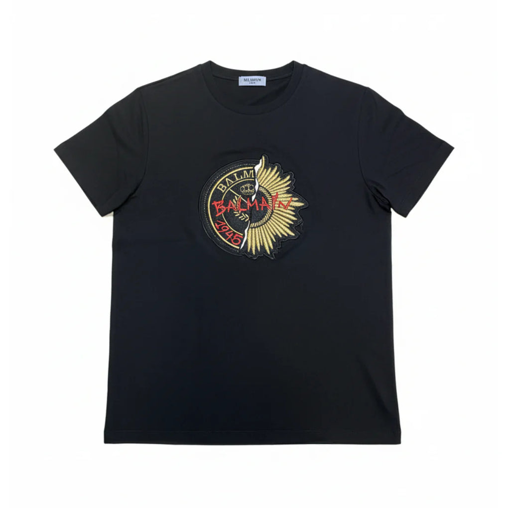 BALMAIN KIDS Black T-shirt With Golden Patch Logo. Classical fit t-shirt from the French fashion house, inspired by Balmain adult collection.