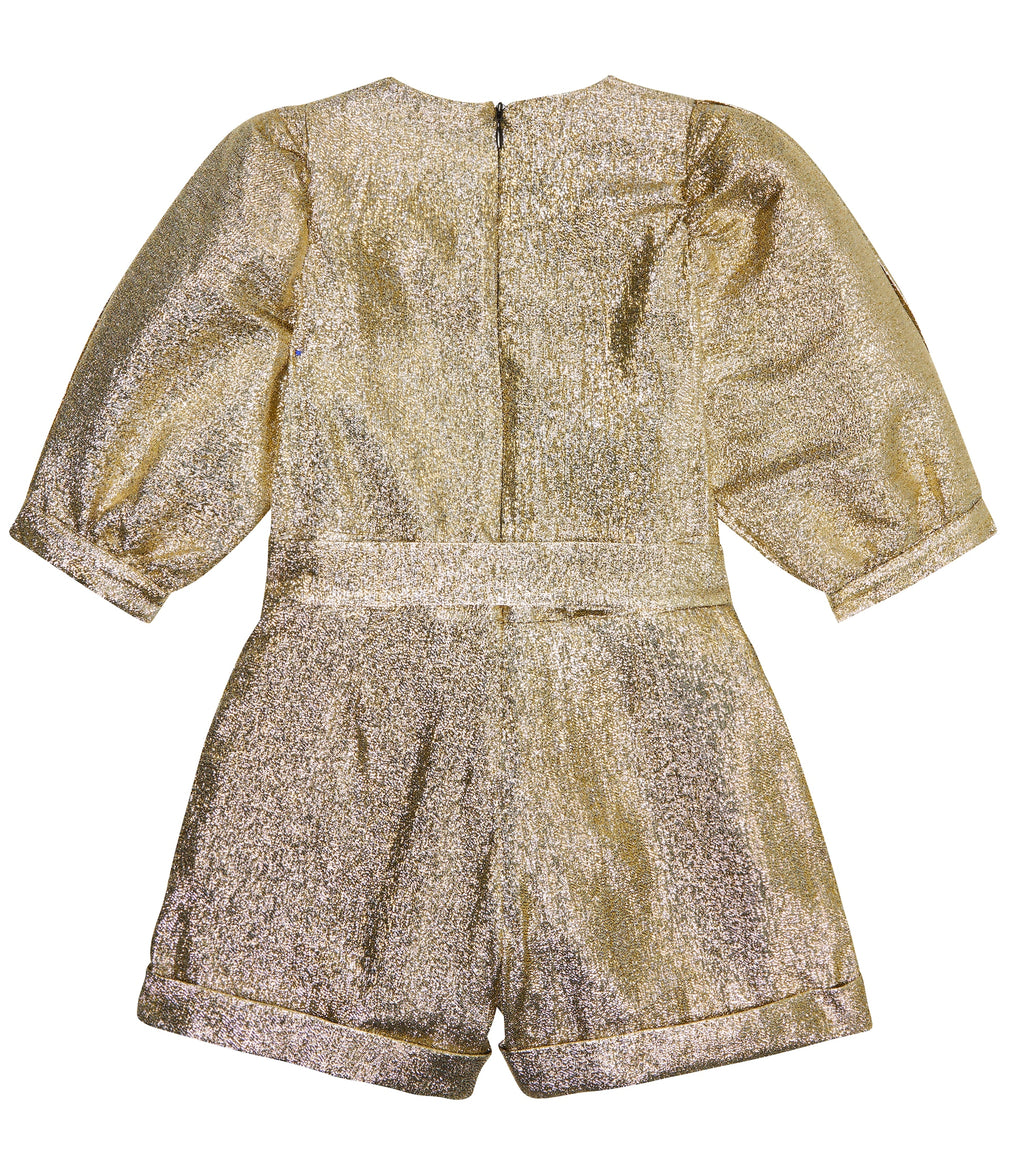 STELLA MCCARTNEY KIDS Golden Jumpsuit. This party piece has elegant details like: puff sleeves, front bow and a discreet zip on the back. Very elegant stand-out outfitr for festive season or parties. Stella McCartney Kids autumn winter collection.