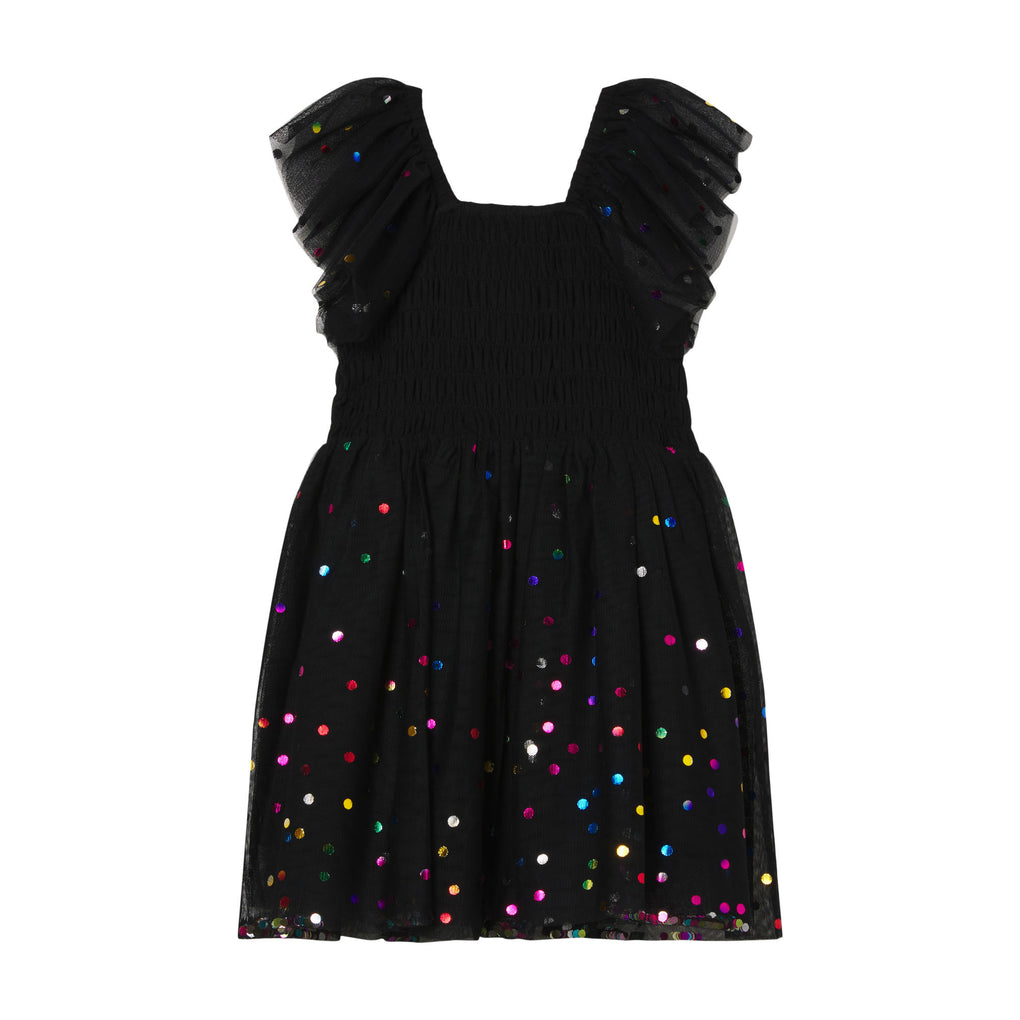 STELLA MCCARTNEY KIDS Party Dress With Tutu Details and fun confetti dots. The bodice has a shirred design, flutter sleeves, and fun confetti pieces around the hem.